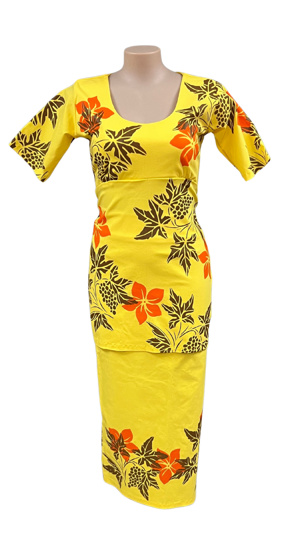 Beautiful Yellow Puletasi with Black & Orange Prints